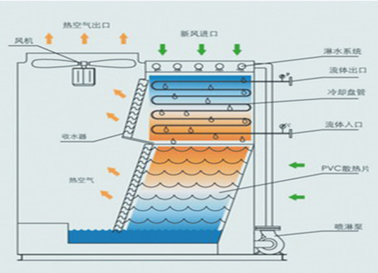 被冷卻水通過盤管與管外噴淋水和空氣進(jìn)行熱質(zhì)交換,避免了被冷卻水與空氣直接接觸而導(dǎo)致的水質(zhì)污染。由于管外有通過PVC填料預(yù)冷卻的噴淋水,其換熱效果明顯優(yōu)于空冷器。如用于冷凍機(jī)終端散熱,冷卻塔的盤管和冷凍機(jī)的熱交換器連接在一起,形成一個封閉的循環(huán)系統(tǒng),而防止了空氣中的如硫化物氣體、灰塵、微生物等對循環(huán)系統(tǒng)的腐蝕,并且冷凍機(jī)的熱交換器不會結(jié)水垢,免除了冷凍機(jī)的除垢保養(yǎng),使冷凍機(jī)節(jié)電,運行壽命增長。