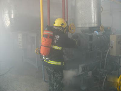 當氨制冷系統(tǒng)發(fā)生漏氨事故時,相關(guān)人員切不可慌不擇路的選擇自我逃生。當班操作人員要沉著鎮(zhèn)靜,以免亂開或錯開機器設(shè)備上的閥門,導致事故進一步擴大。迅速報警,撤離疏散污染區(qū)人員至上風處,并立即隔離150M,嚴格限制閑雜人員出入。必須正確判斷情況,組織有經(jīng)驗的技工進入現(xiàn)場搶救。處理人員必須佩戴正壓式呼吸器,穿防毒服。戴好防護人員進入現(xiàn)場,在水壓防護下處理泄漏點。關(guān)閉閥門或加密封等。在整個氨制冷系統(tǒng)中及時發(fā)現(xiàn)漏氨部位,做到早發(fā)現(xiàn),早處理。如是高壓管道泄漏,應立即停止壓縮機運行,切斷漏氨部位與系統(tǒng)連通的管道。若管道不長,可采用放空的辦法,待管內(nèi)余氨放完,并置換后進行補焊。如低壓管道(如冷庫內(nèi)冷卻設(shè)備)漏氨,應迅速查明漏點,關(guān)閉其供液閥。由于庫房氨汽甚濃,可開風機排除,并用酸酸溶液噴霧中和。若條件允許,可啟動壓縮機將該冷卻設(shè)備內(nèi)氨液抽回。操作人員可根據(jù)制冷系統(tǒng)不同特點和具體情況,采取靈活、安全、有效的處理方法。