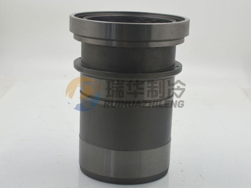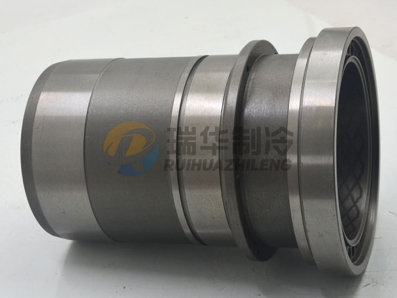 缸套的上部法蘭同時(shí)又是吸氣閥閥座,閥座座面低于法蘭的上端面,這個(gè)差距決定于吸氣閥片的厚度和升程;法蘭上有30個(gè)圓孔--吸氣孔口,它與吸氣腔相連。其中還有6個(gè)略小等角布置的圓孔可以通過(guò)頂開(kāi)吸氣閥片的小頂桿,中部有能量調(diào)節(jié)用的轉(zhuǎn)動(dòng)環(huán)和檔環(huán)槽。